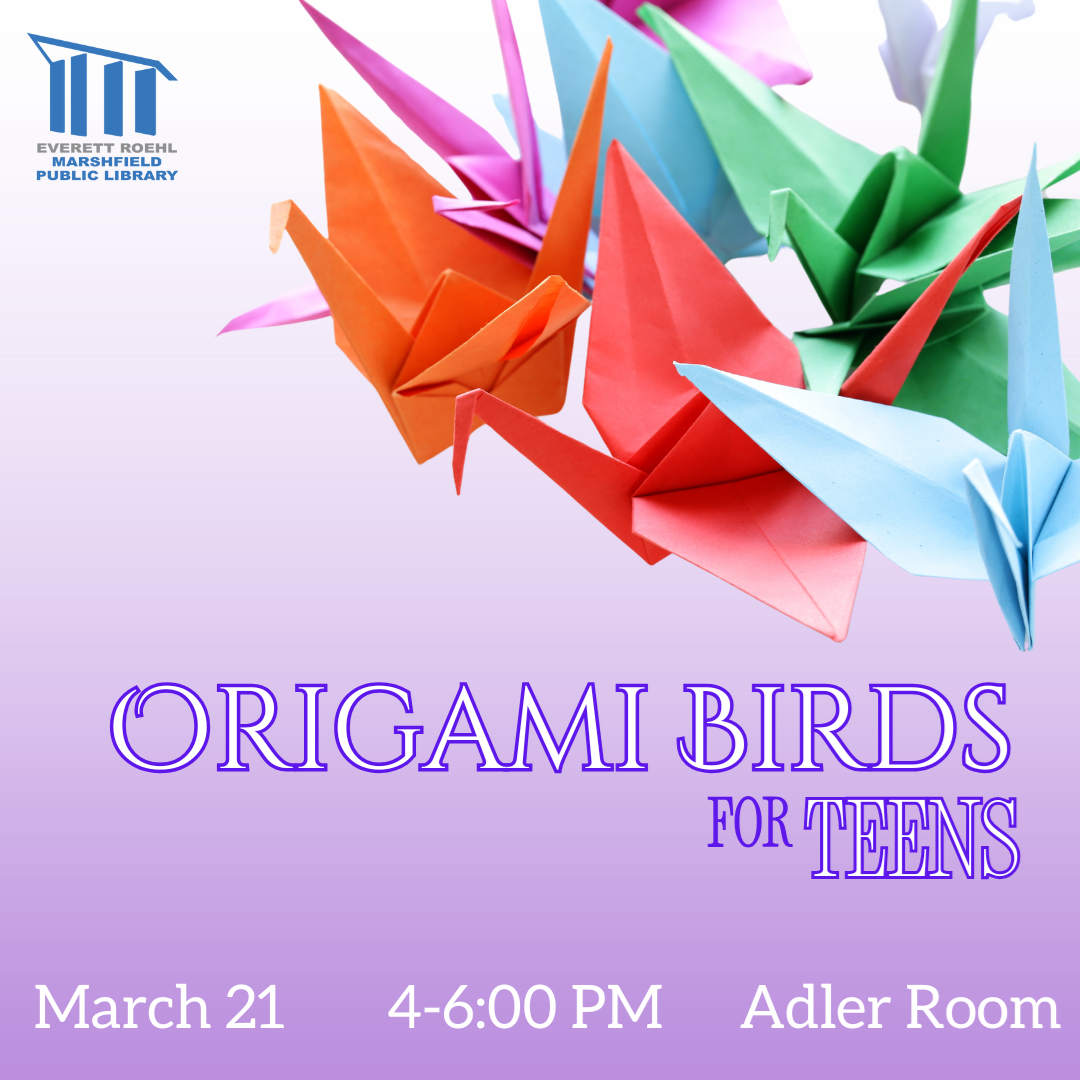 Origami Birds for Teens Friday, March 21 4:00 PM, JP Adler Room We invite everyone in grades 6 through 12 to come and learn how to make a whole flock of origami bird crafts! Snacks will be provided.