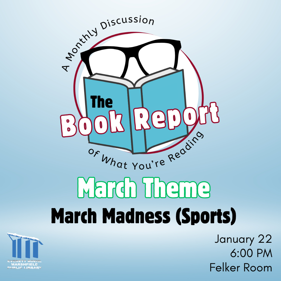 The Book ReportWednesday, March 26 6:00 PM, Felker Room It's a book club with a new spin! We're not going to tell you what to read. Each month we will provide a theme. Then you choose what you'd like to read within that theme! When you come to the monthly meeting, we want you to tell us all about what you've read. And that's why it's called The Book Report! Come join in the fun and hear about what your fellow readers have gotten into each month. The theme for March is March Madness (Sports)! Books about sports expand way beyond just biographies of athletes. Whether it's baseball stories from John Grisham, mysteries from the world of horse racing with Dick Francis, or even romance novels about tennis, the sporting world reaches all types of books. Come tell us about one of your favorites!