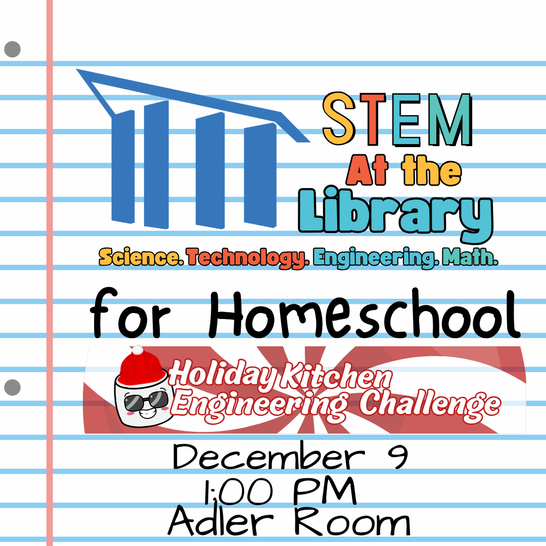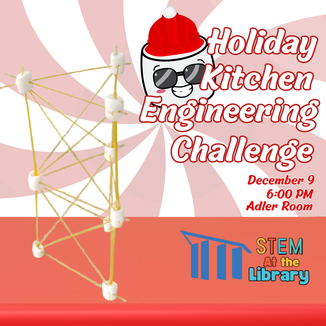 Holiday Kitchen Engineering ChallengeSTEM at the Library Tuesday, December 9 6:00 PM, Adler Room Bring a friend and build a tower out of spaghetti noodles and marshmallows while enjoying hot cocoa. Learn about structural engineering through building, learn fundamental concepts like compression, tension, and load-bearing capacity by experimenting with different shapes. Who can build the highest structure? Let's find out!