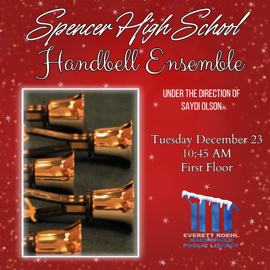 Every year the Library is pleased to host a number of holiday performances by a variety of community groups. This year we are blessed to have more performances than ever before! On November 30, we will have Nutcracker Storytime with Main Street Conservatory of Dance. This is a very popular program every year as members of the Conservatory read the story of the Nutcracker and perform selections from the Nutcracker Ballet. On December 9, we will have a Holiday Duet featuring two members of the Central Wisconsin Symphony Orchestra performing a selection of holiday pieces. That same week, on December 11, we will have a visit by the Marshfield High School Madrigal Singers. Traditionally the Library has been a stop on their Sunday tour of the community. We feel very fortunate they were able to squeeze in a stop on their Thursday tour. They're a very in demand group this time of year! Speaking of touring high school performers, the Marshfield High School Jazz Band will bring a hot performance of cool jazz holiday arrangements on the morning of December 16. And last, but certainly not least, the afternoon of December 23 will see our annual visit from the Spencer High School Handbell Ensemble. The Library will have plenty of cheer this holiday season with so many wonderful performances!