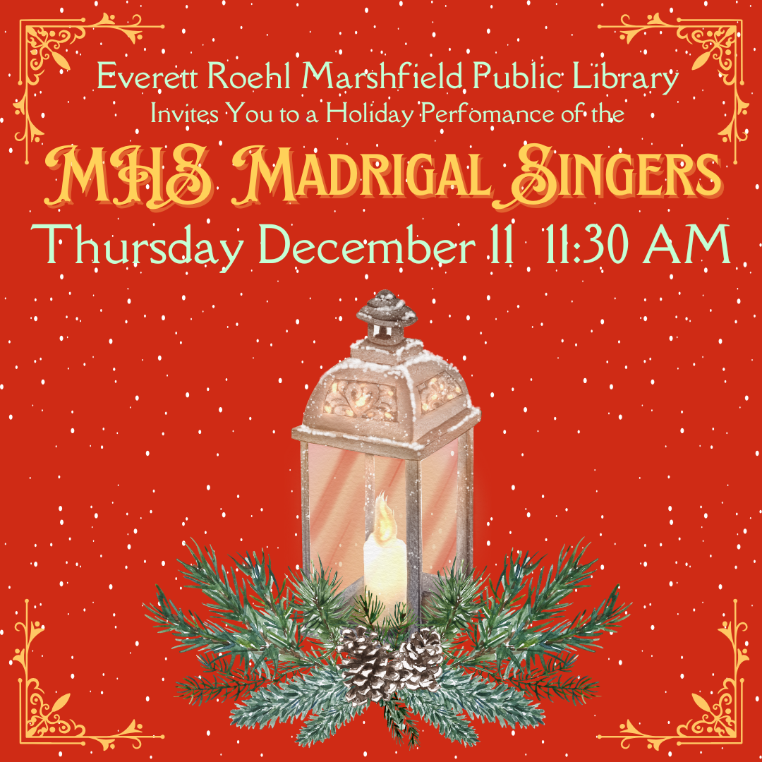 MHS Madrigal Singers Holiday Performance Thursday, December 11 11:30 AM, 1st Floor Join us for a performance of holiday songs by the Marshfield High School Madrigal Singers under the direction of choir director Josh Olson.