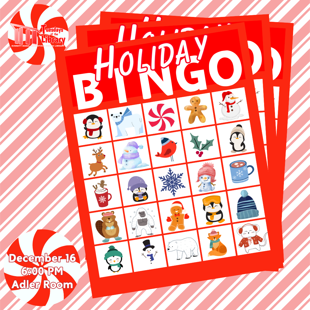 Holiday BingoTuesdays at the Library Tuesday, December 16 6:00 PM, Adler Room Join us for an evening of bingo and holiday cheer!