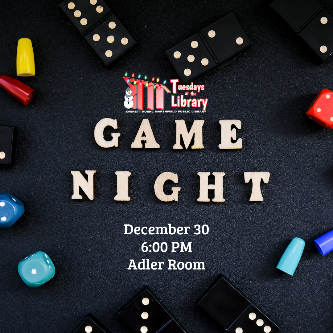 Game NightTuesdays at the Library Tuesday, December 30 6:00 PM, Adler Room It's the last Tuesday of the year but we'll be here! We'll bring out our board games, card games, and more for one more night of fun this year!