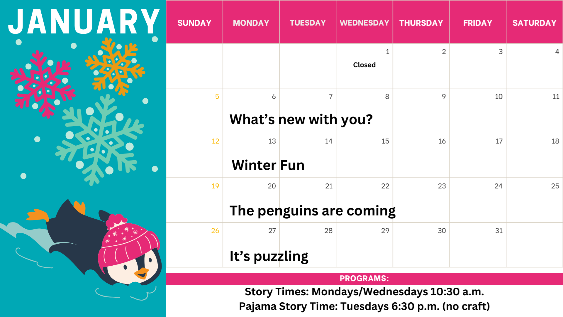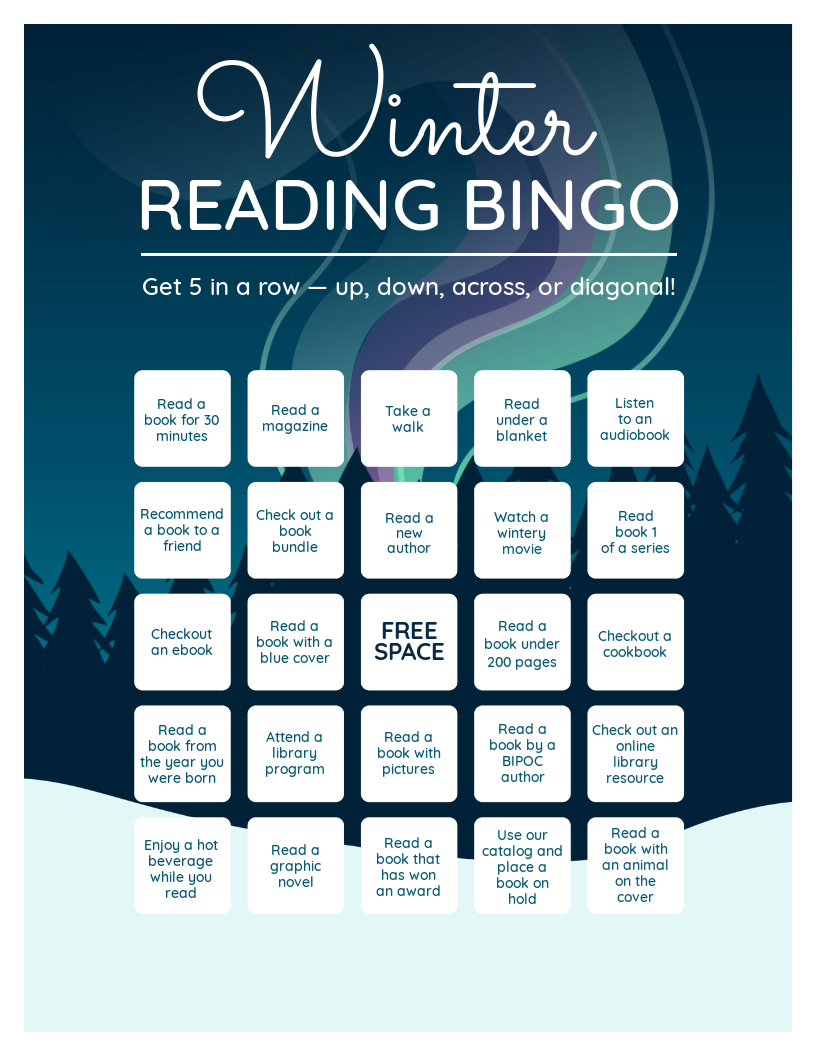 Bingo rules-once you get a bingo, bring your sheet in for a prize! (Candy or something from the bookstore) Good through January 31st.