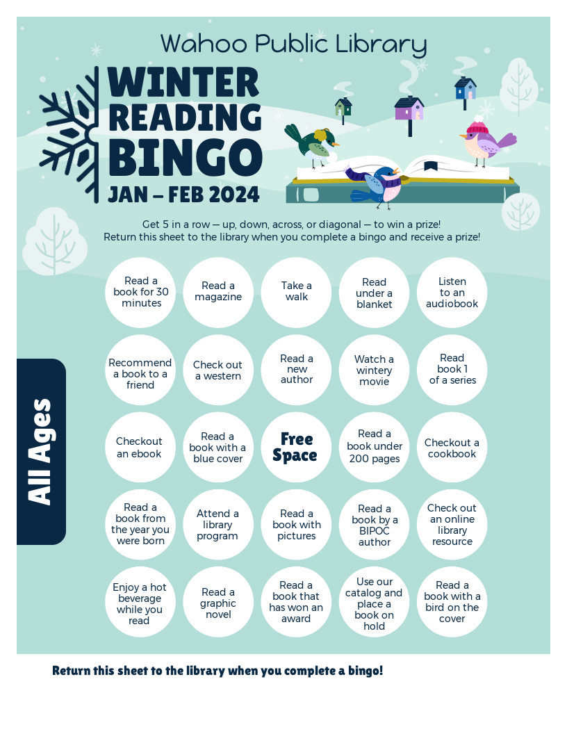 Print out the bingo sheet or pick one up at the library and see if you can complete it by the end of February!