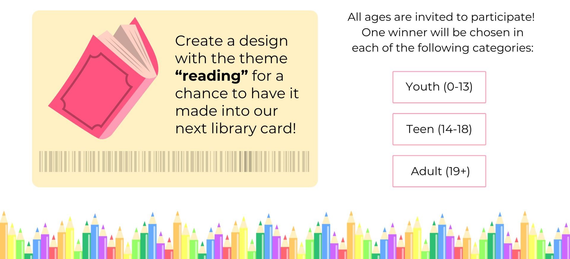 To celebrate, we're holding a contest! All ages are invited to participate in designing a new library card with the theme "reading" for the chance to have it made into our next card. Submit your designs by September 30th for a chance to win! One winner will be chosen in each age category, limit one entry per person.