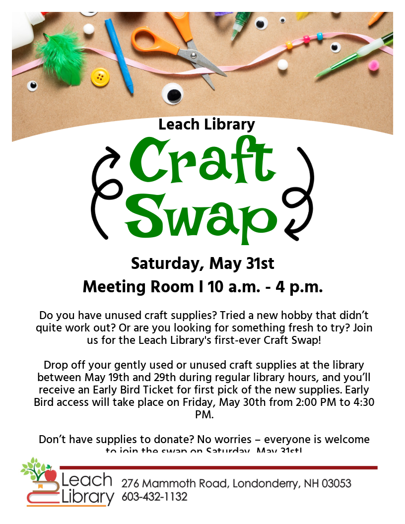 Butterfly Mosaic Craft Children are invited to the Leach Library on Monday, May 12 at 4:30 p.m. to create a foam butterfly mosaic. Crafts will be provided, and library staff will be on hand to offer assistance. Registration is required and begins on Monday, May 5.