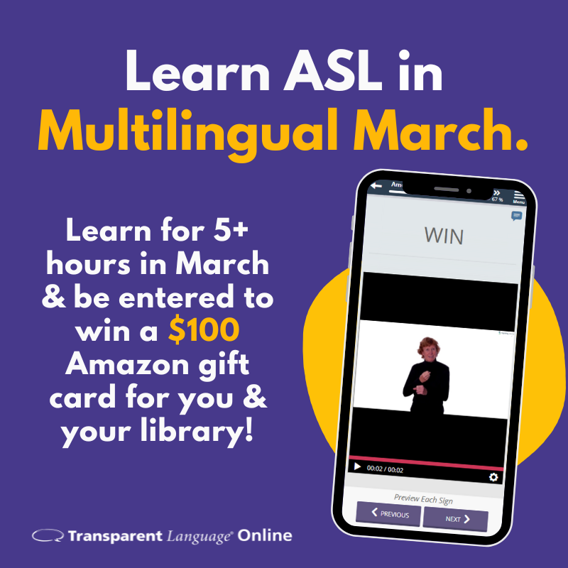 Compete against language learners around the world during Multilingual March! Spend at least 5 hours learning any of the 140+ languages in Transparent Language Online for Libraries during the month of March to be entered for a chance to win a $100 Amazon gift card - one for you and one for the library! Click here to get started with Transparent Language.