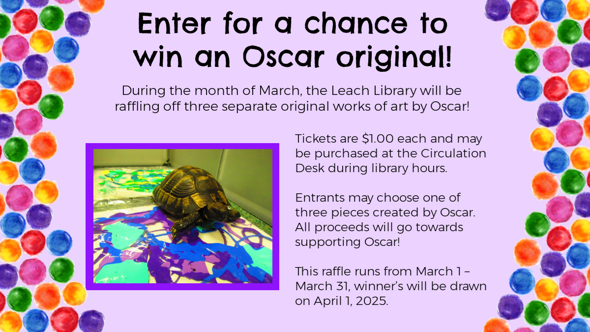 Wednesday, March 26 at 7:00 pm Wednesday, April 2 at 7:00 pm Wednesday, May 7 at 7:00 pm Leach Library Board of Trustees Meeting (open to the public) Monday, April 14 at 6:30 pm Monday, May 12 at 1:00 pm Friends of the Leach Library Meeting (open to the public) Thursday, May 1 at 4:30 pm Children's Book Bingo * Saturday, May 3 at 10:00 am Intro to Dungeons and Dragons * Saturday, May 3 Free Comic Book Day While supplies last* Wednesday, May 14 at 4:30 pm Let's Make Something Together - Make Pipe Cleaner Animals *