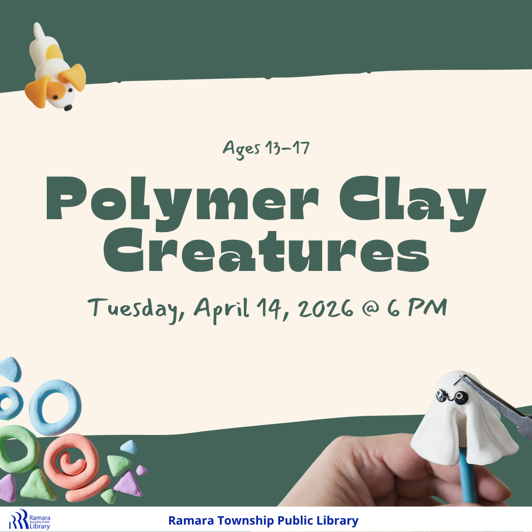 Polymer Clay Creatures Tuesday, April 14 6 PM - 7:30 Ramara Centre Ages 13-17 RSVP Calling all Teens! Want to make your own polymer clay creatures? Join in the fun on Tuesday!