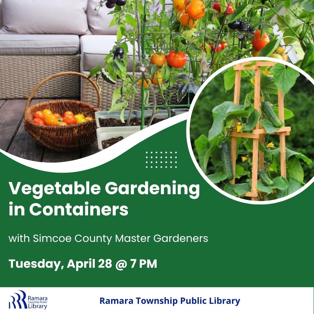 Vegetable Gardening in Containers Tuesday, April 28 7:00 PM - 8:00 PM Ramara Centre RSVP Join Pat from the Simcoe County Master Gardeners for an inspiring and practical presentation on Growing Vegetables in Containers.
