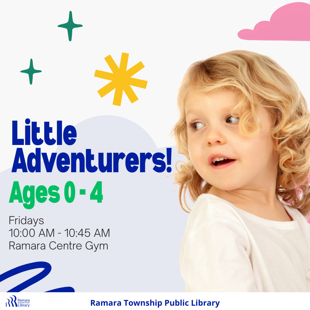 Little Adventurers Friday, April 17 10:00 AM - 10:45 AM Ramara Centre Ages 0 - 4 RSVP or Drop In! It is adventure time! Stories, songs, activities, and a craft. There is something for everyone at Little Adventurers!