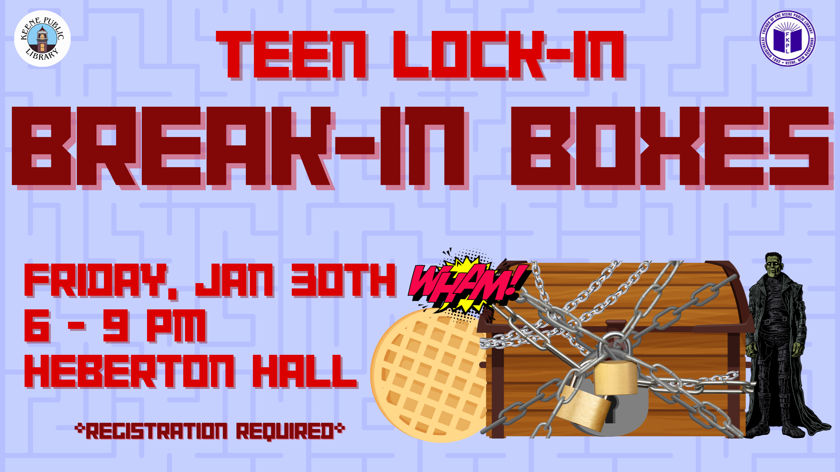 Hey Middle and High Schoolers! Join us for a new, unique take on escape rooms with our BREAK-IN BOXES! Compete in teams to problem solve puzzles, crack codes, and break into your box! Fight through three rounds, themed around Stranger Things, Frankenstein, and comics—quickest team wins a prize!