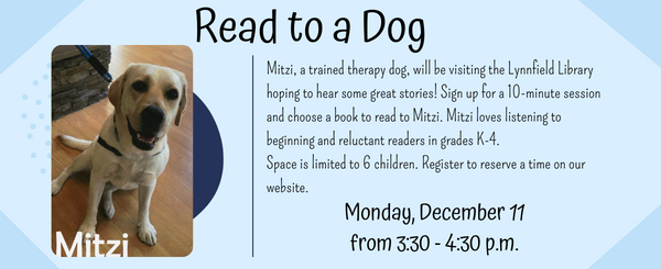 Mitzi, a trained therapy dog, will be visiting the Lynnfield Library hoping to hear some great stories! Children may sign up for a 10-minute session and choose a book or selection from a book to read to her. Mitzi is a patient listener, so reading to her is good practice for readers who are still struggling a bit as well as pros. Program geared towards children in grades K-4. Space is limited to 6 children.