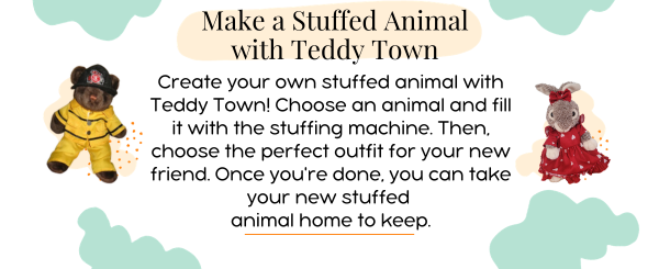 Create your own stuffed animal with Teddy Town! Choose an animal and fill it with the stuffing machine. Then, choose the perfect outfit for your new friend. Once you're done, you can take your new stuffed animal home to keep. Registration is required, as supplies are limited.