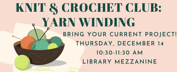 Love knitting, crocheting, or other handicrafts? Join us for our monthly Knit & Crochet Club! We'll be meeting on the Mezzanine to work on our own projects and chat. This month we'll also have our yarn winder and swift available from our Library of Things. If you have skeins of yarn that you need wound up, bring them by! No registration required.