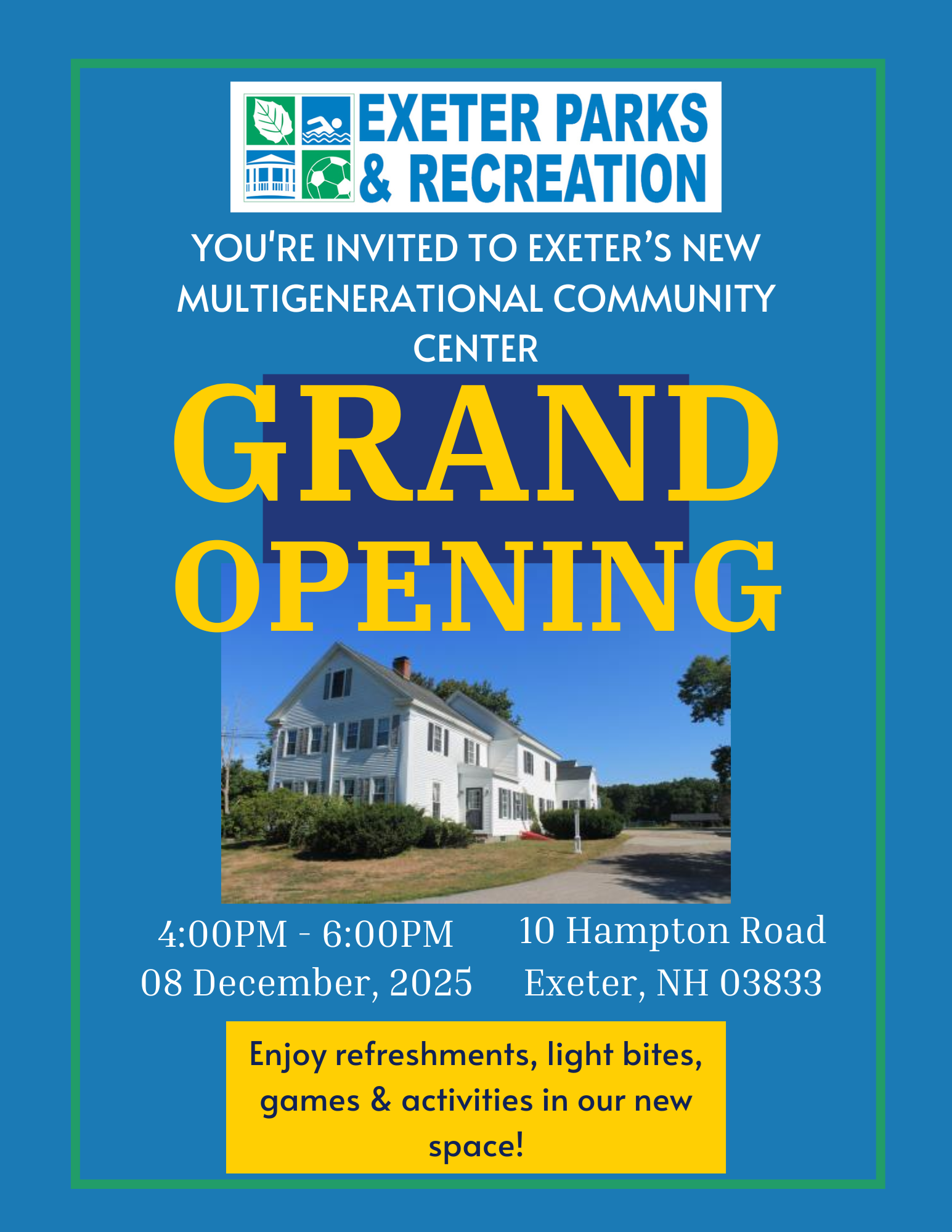 Join Exeter Parks and Rec for the Grand Opening of the new Multigenerational Community Center at 10 Hampton Road on Monday, December 8th from 4 - 6 PM. Please click the button below for more information. |