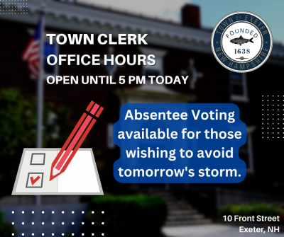 | Exeter Town Voting Due to the impending snowstorm, the Town Clerk's Office will be open today until 5 PM. Residents wishing to avoid traveling to the polls in the snow tomorrow can vote by absentee ballot in the Town Clerk's Office. |