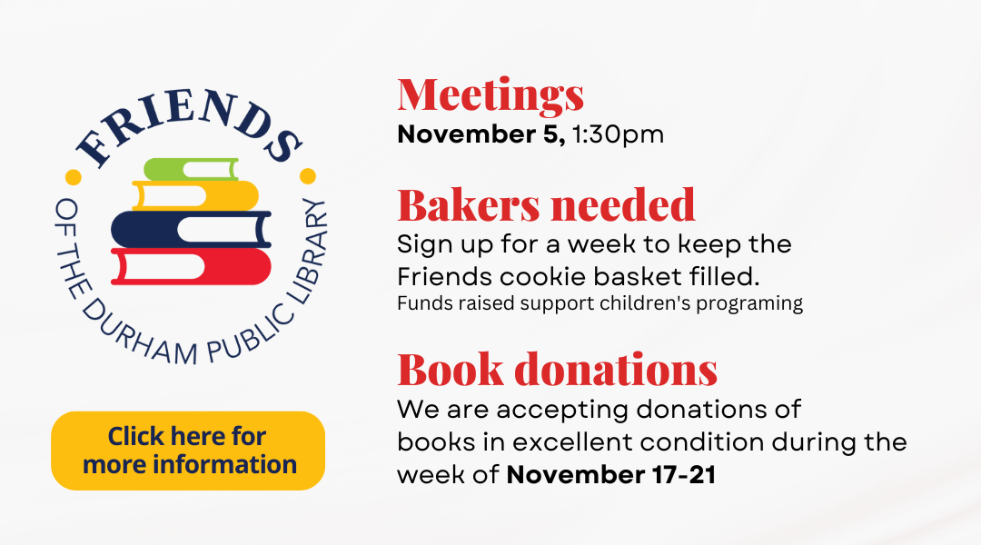| | | Regular Hours Monday | 10:00 am - 8:00 pm Tuesday | 10:00 am - 8:00 pm Wednesday | 10:00 am - 8:00 pm Thursday | 10:00 am - 6:00 pm Friday | 10:00 am - 5:00 pm Saturday | 10:00 am - 2:00 pm |  |  |  | 49 Madbury Rd, Durham, NH 03824 Questions? Call or email us at 603-868-6699 or durhampl@gmail.com |  | durhampubliclibrary.org |