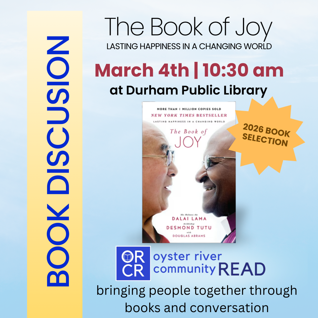 A Community Read brings people together around a shared story sparking conversation, connection, and new perspectives. It invites neighbors who might never otherwise meet to gather, discuss ideas, and explore themes that matter to our town and our time. This year’s Oyster River Community Read (ORCR) is The Book of Joy by Desmond Tutu and the Dalai Lama. Pick up your copy at the Library today! |