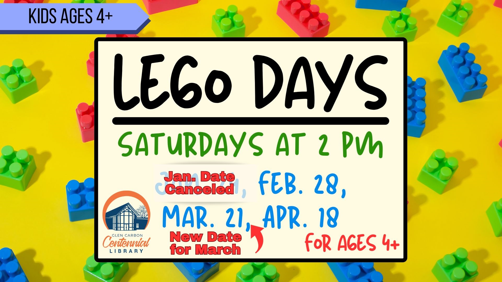 Lego DaysAges 4+ Saturdays Monthly at 2 pm February 28 Come to the Library to show off your Lego skills! Build and create your own Lego masterpiece to show off at the Library!