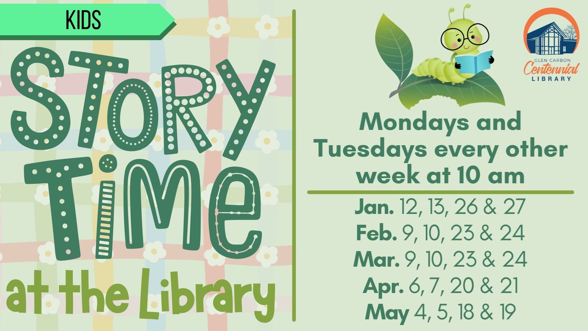 Storytime Mondays & Tuesdays Biweekly at 10 am Mondays: Feb. 9 & 23, Mar. 9 & 23 Tuesdays: Feb 10 & 24, Mar. 9 & 23 Join us for stories, songs, crafts, rhymes, and more! Storytime builds your Pre-K kiddos' literacy skills to help them prep for Kindergarten and 1st grade! Planned for Pre-K children. Drop In