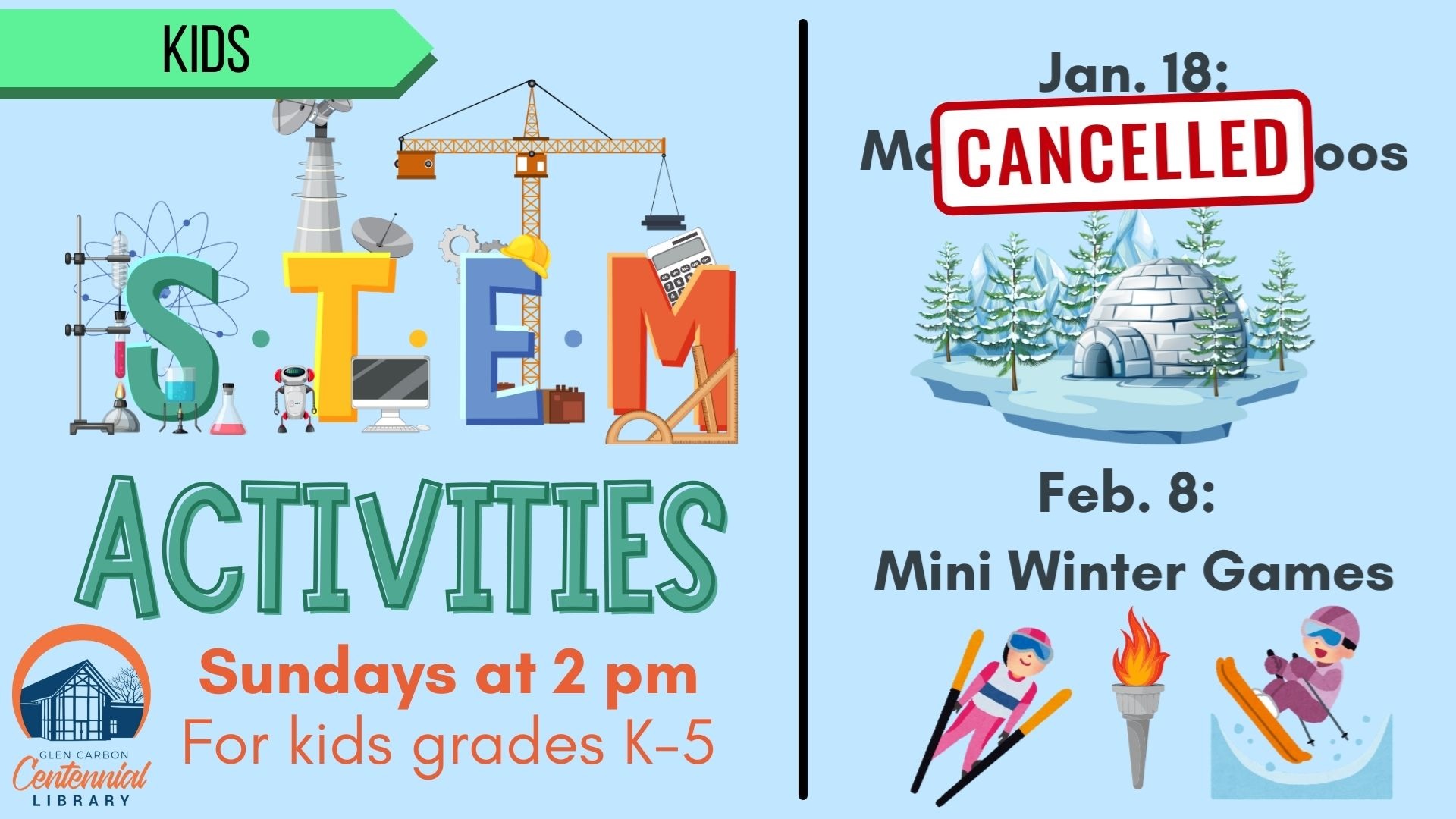 STEM Activities Grades K to 5 Sundays Monthly at 2 pm February 8: Mini Winter Games Do you enjoy exploring science, technology, engineering, and math in fun, crafty ways? Then come on in for this in-person program at the Library! Join us in February as we learn about winter games and build our own ramps! Drop In