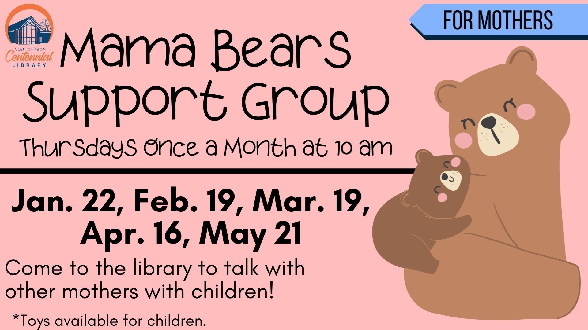 Mama Bear Support GroupThursdays Monthly at 10 am February 19 Share your feelings and concerns with other moms in an accepting environment. We’ll have toys available for children to play with, and a library staff member will facilitate the discussion. This program is not a replacement for mental health services but an opportunity to feel less isolated on your journey as a parent or guardian.