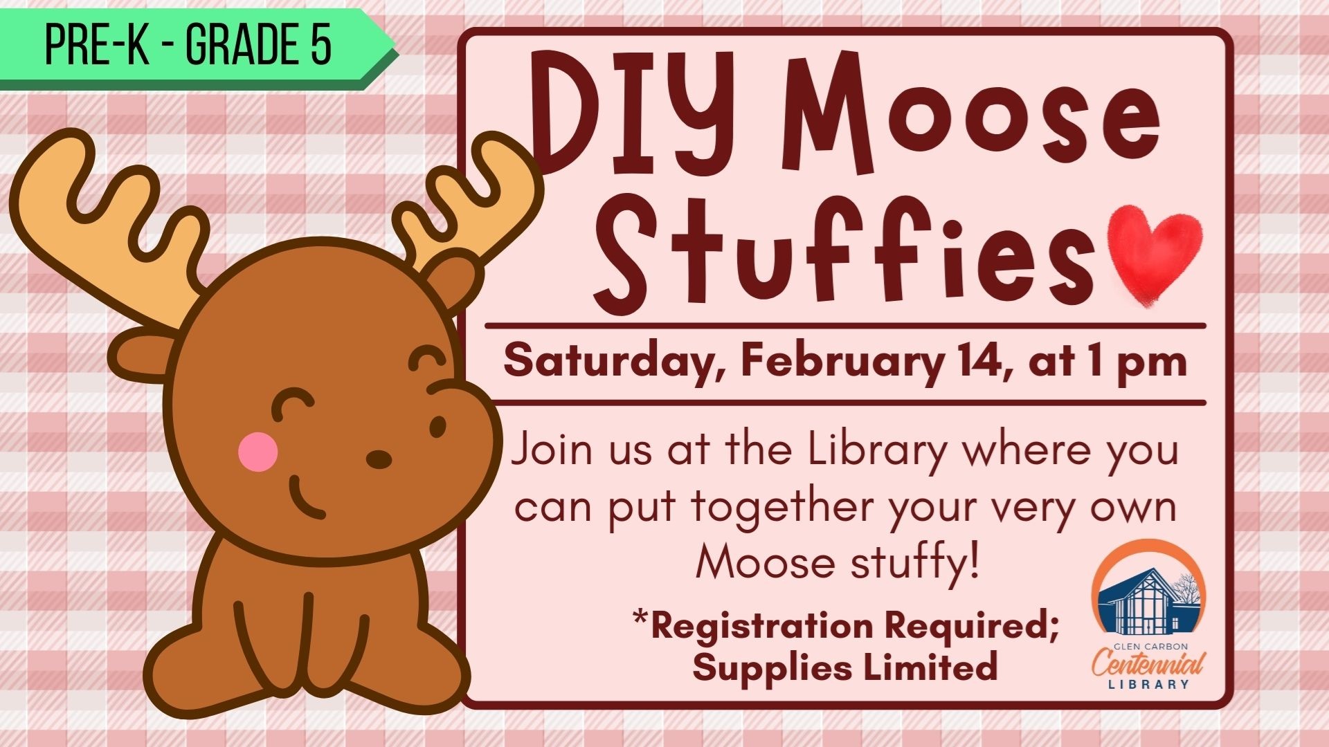 DIY Moose Stuffies Pre-K to Grade 5 Saturday, February 14, at 1 pm Join us at the library to make your very own moose stuffy! You will stuff your moose, name it, and make a wish to put inside. We'll then sit with our moose stuffies and do a short storytime.
