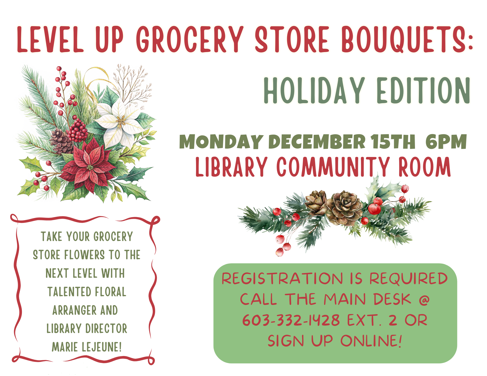Discover how to style budget-friendly grocery store flowers to create professional looking arrangements for the holidays! The class will be led by Library Director and talented floral arranger, Marie Lejeune. While we will supply some materials, please remember to bring your own flowers (one large or two small bouquets) and vase. |
