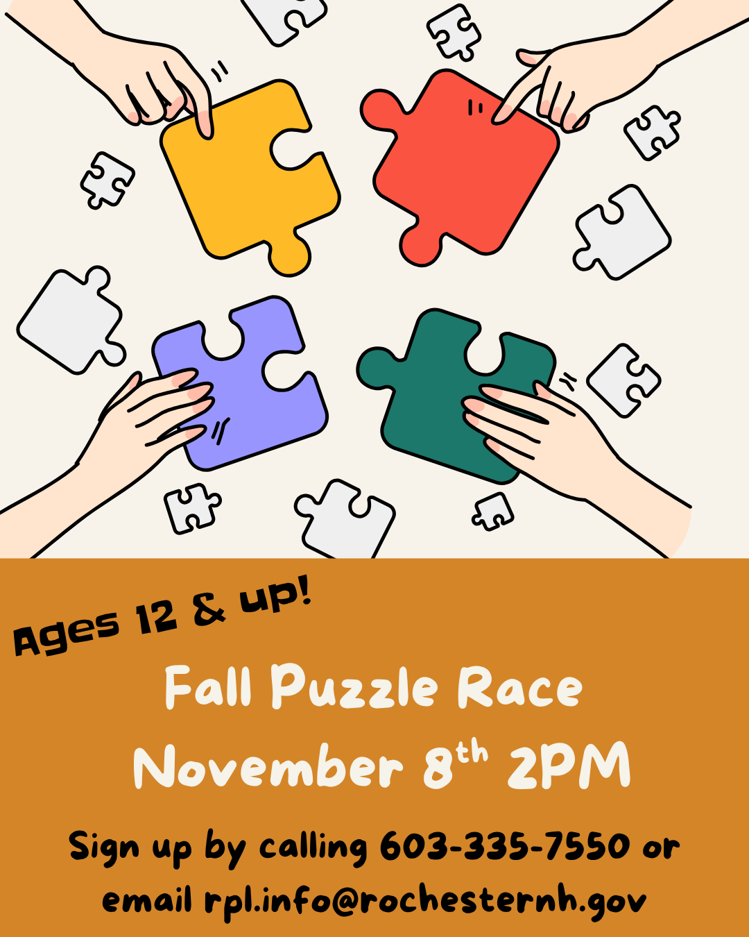 Gather your team of up to four members (ages 12 and up) to take part in an exciting jigsaw puzzle competition against other groups! Teams will be given 90 minutes to assemble their puzzle—each team will work on a 500-piece puzzle provided by the library. The team that finishes their puzzle first, or comes closest to completion when the bell rings, will win a prize! We can accommodate up to six teams.