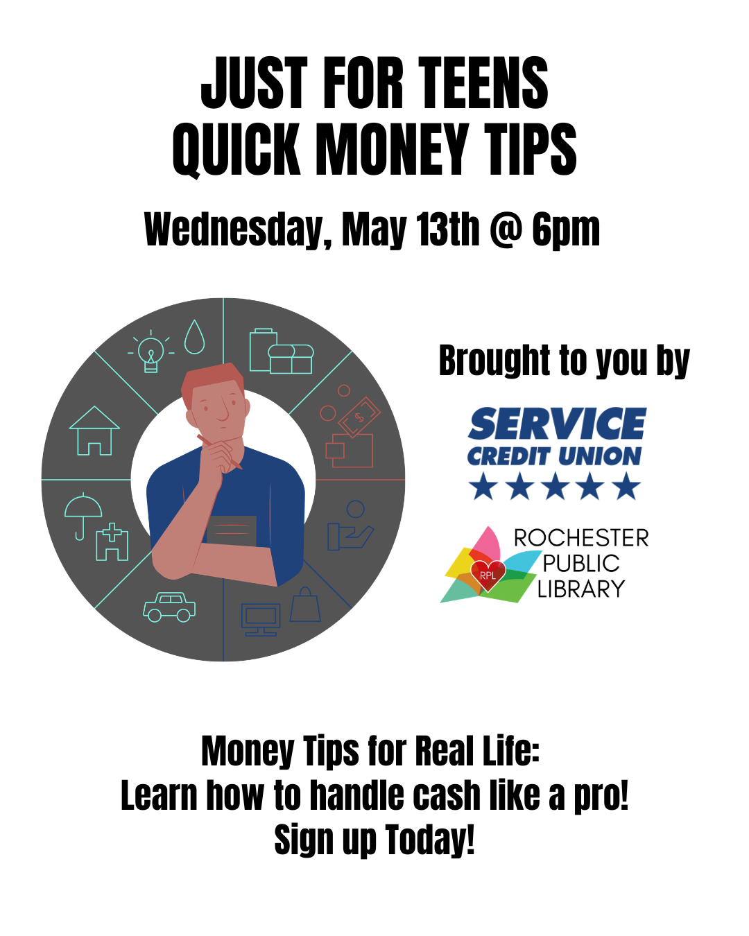 Monday, May 13th 6-7pm in the Community Room A representative from Service Credit Union will be here for a special Teens only program.