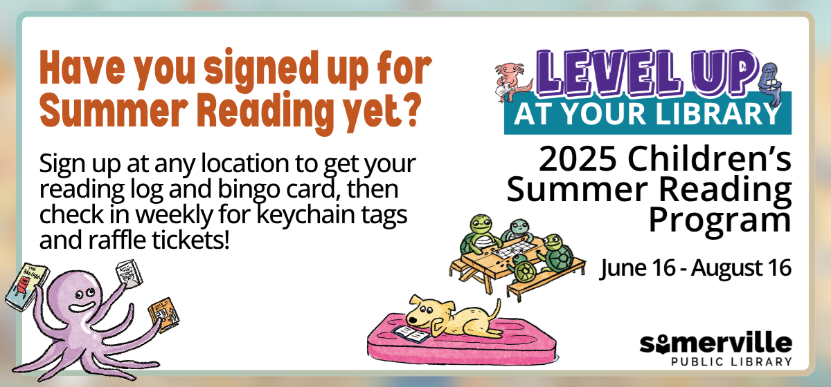 Announcements On Saturday, July 26, we will be hosting our fifth annual Comix Con, a free event for all members of the community. Scroll down to learn more! This newsletter lets you know about many of our events, but did you know we have even more? Visit our online calendar to explore them all! Upcoming Closures: All Somerville Public Library locations will be closed on Friday, July 4, for Independence Day. The Central Library will be closed on Sundays in the summer and reopen on September 7. The East Branch Library will be OPEN on Sundays in the summer from 1pm to 5pm, June 22 through August 24.