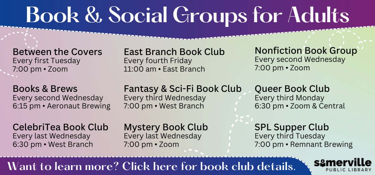 Announcements April is Fair Housing Month! Please join us, in partnership with the Somerville Fair Housing Commission and the Department of Racial and Social Justice, as we come together in conversation about housing in Somerville. Scroll for details. This newsletter lets you know about many of our events, but did you know we have even more? Visit our online calendar to explore them all! Upcoming Closures: All Somerville Public Library locations will be closed on Monday, April 21, for Patriots' Day.