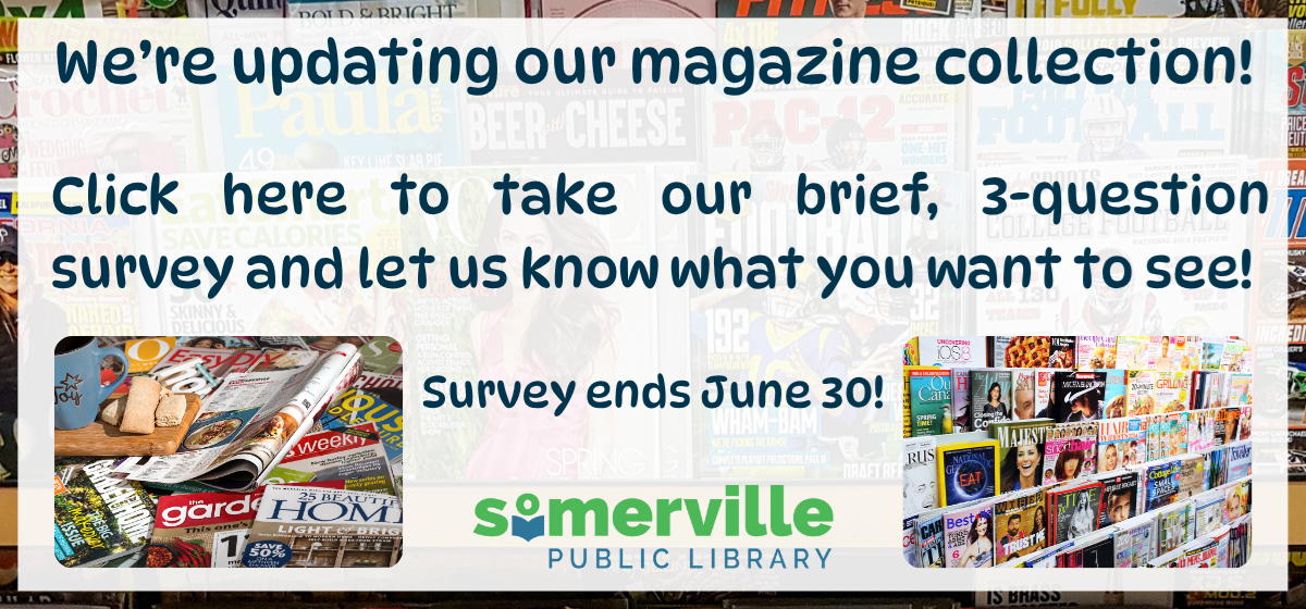 Summer reading starts in just a few weeks! Scroll below to learn more. Additionally, the library is seeking opinions on our magazine collection − fill out our short survey to let us know what you would like to see! Upcoming Closures: All Somerville Public Library locations will be closed on Thursday, June 19, for Juneteenth.