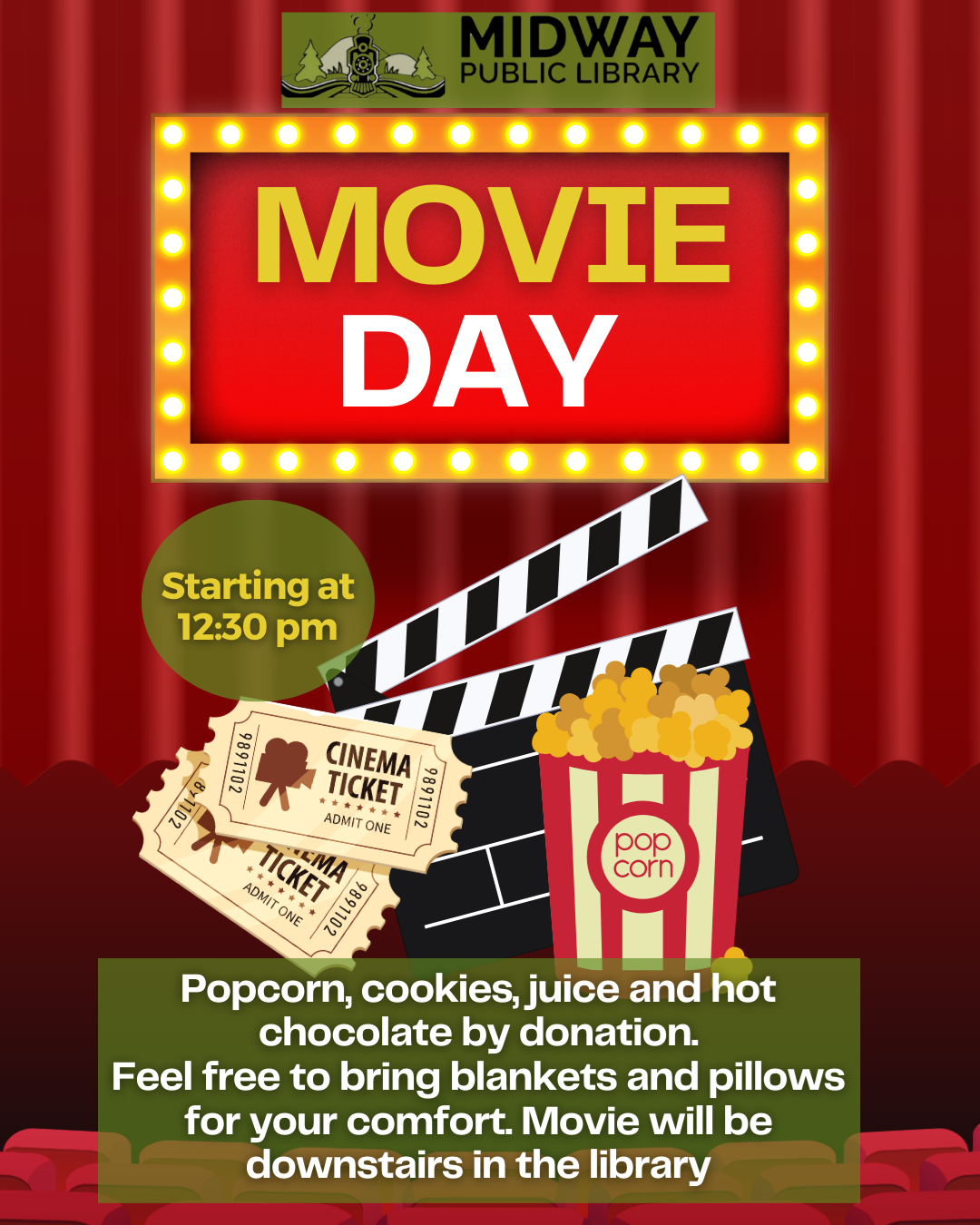 December 20th, starting at 12:30pm Join us Friday, December 20th, for Movie Day! Starting at 12:30 pm! Popcorn, cookies, juice and hot chocolate are available by donation. The movie will be playing downstairs, for your comfort feel free to bring some blankets and pillows!