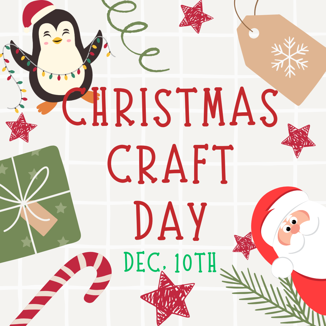 Christmas Craft Day. December 10th 3:30-6:00pm. Registration Required. We will be having some fun Christmas crafts on Tuesday, December 10th, 3:30-6:00pm. Please register on the link below so we have enough crafting supplies and cookies! Register by December 3rd. https://forms.gle/6qafVTFCF1JeSguV9