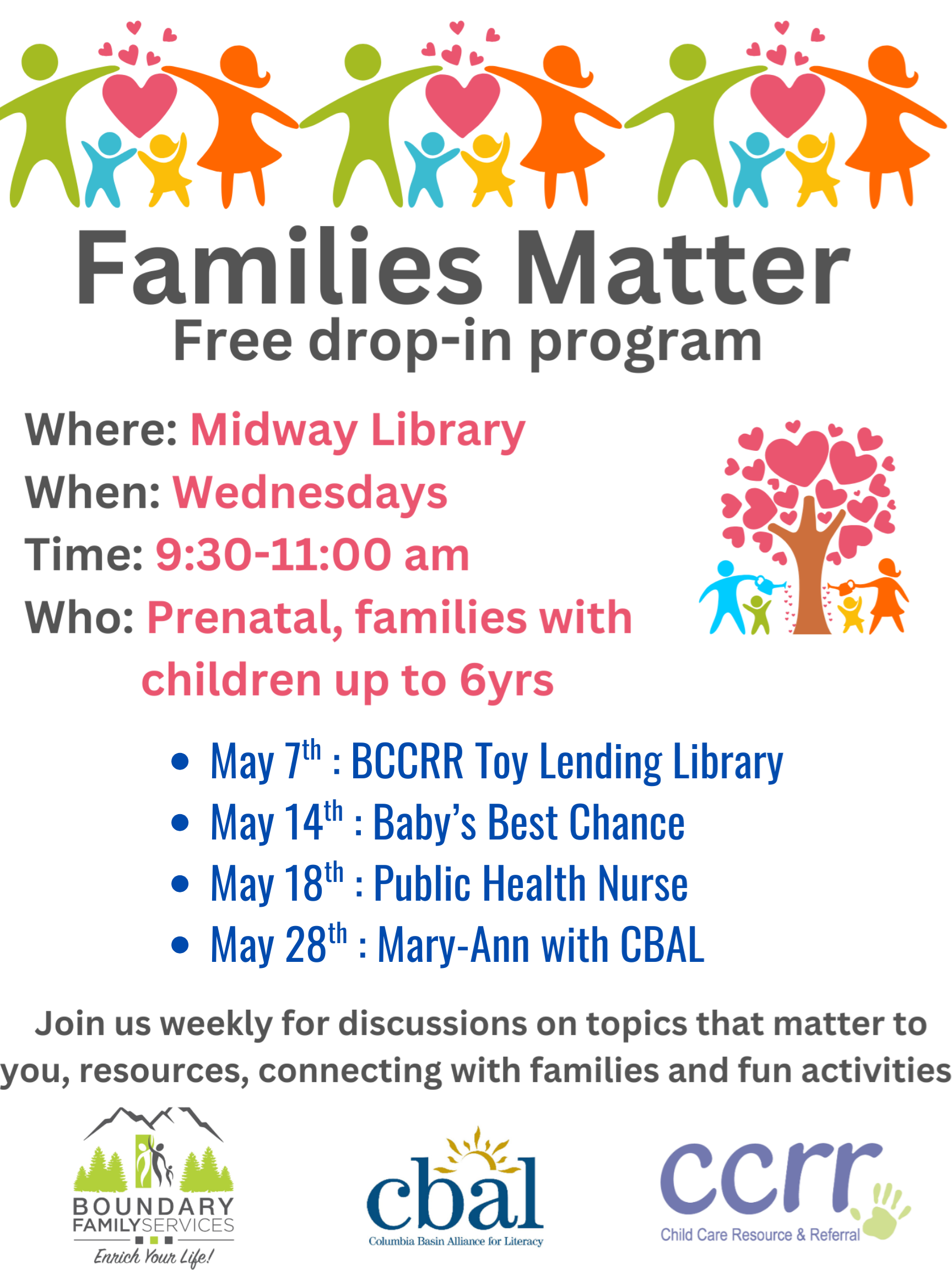 Families Matter Wednesday, May 28th,9:30-11:00 am Families Matter is a free drop-in program. This programming is geared to families with children ages 0-6 and prenatal families. Join us for discussions on topics that matter to you, resources, connecting with families and fun activities!