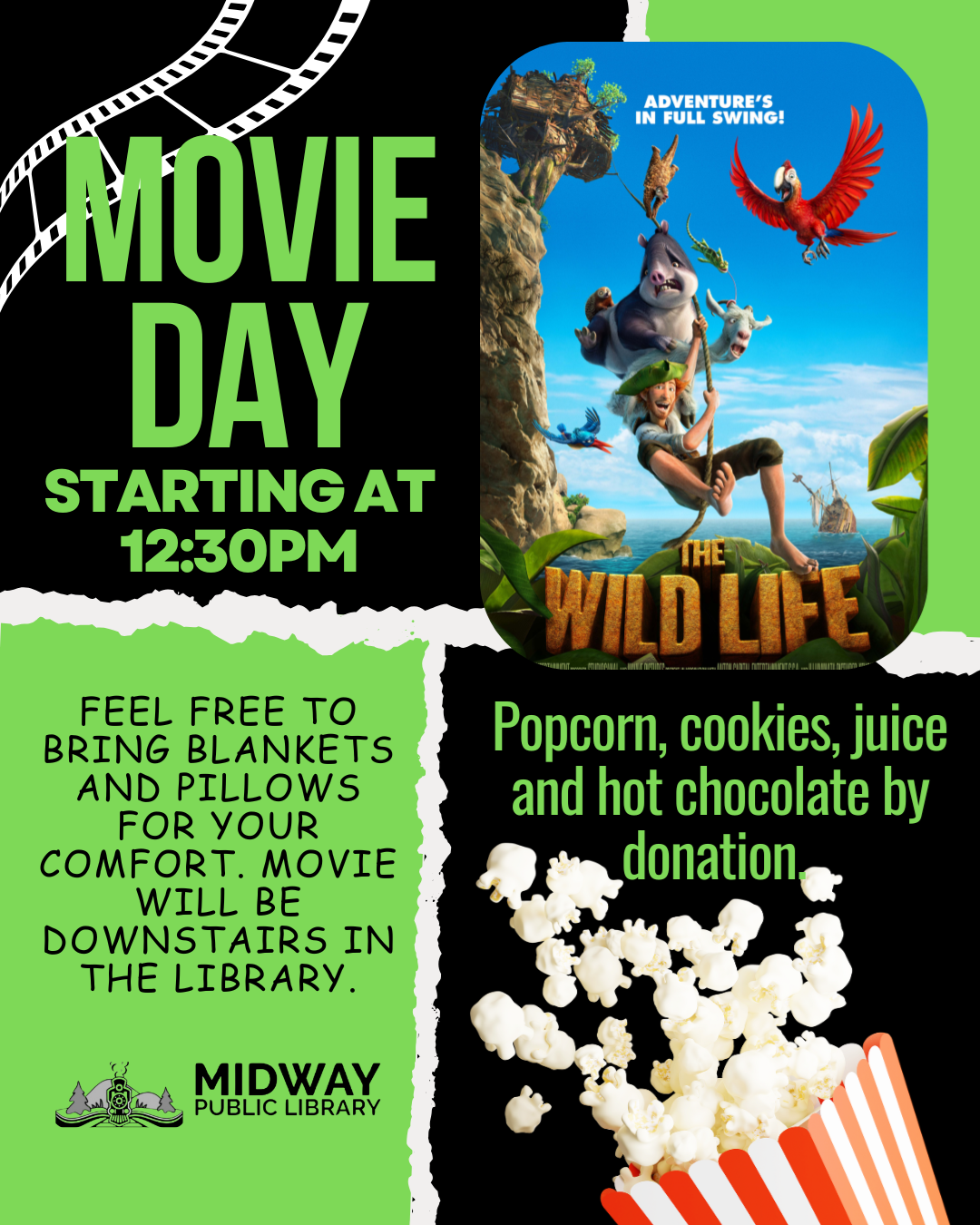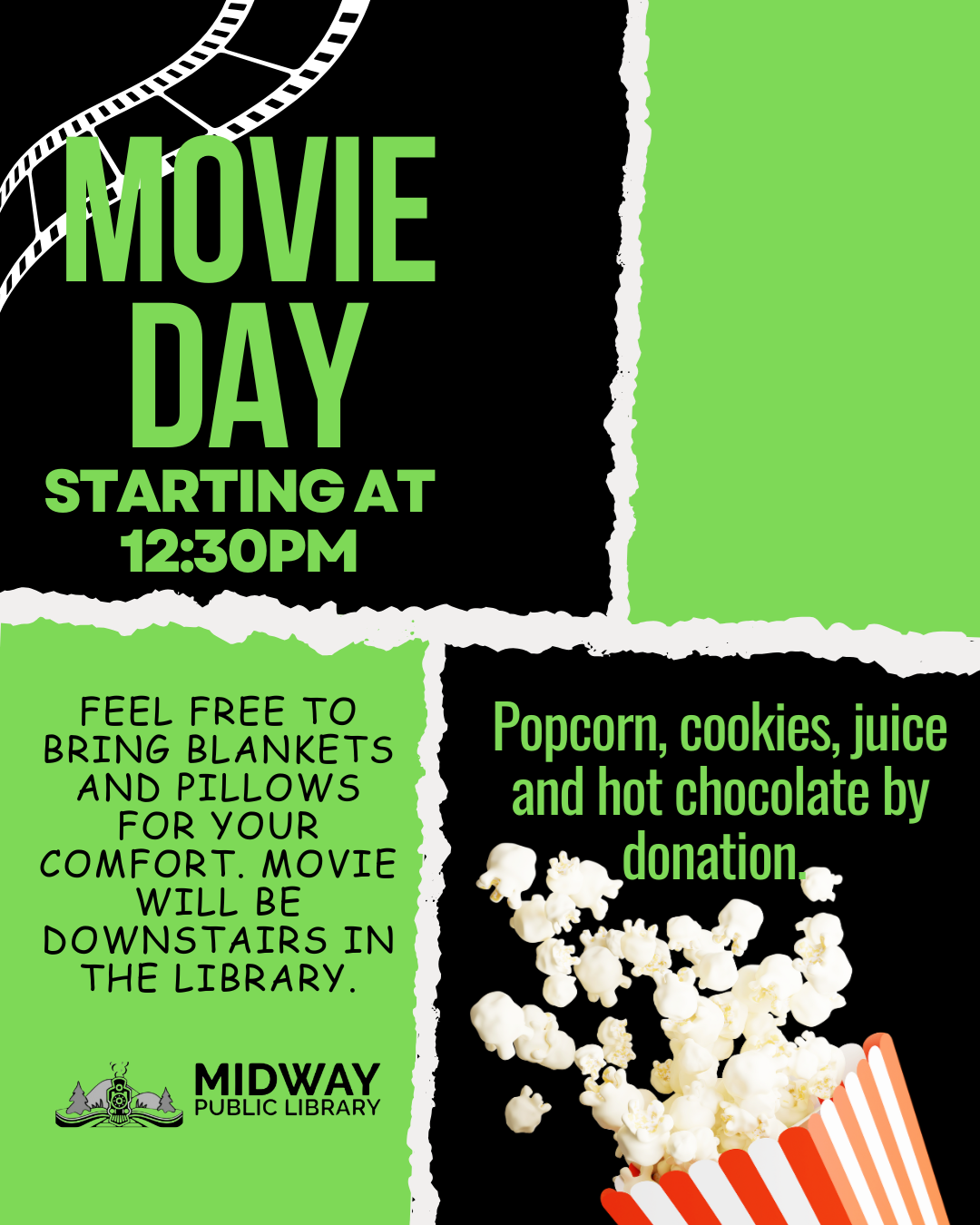 Movie Day Friday, May 20th,starting at 12:30pm Join us Friday, May 2nd, for Movie Day, starting at 12:30 pm! Popcorn, cookies, juice and hot chocolate are available by donation. The movie will be playing downstairs, for your comfort feel free to bring some blankets and pillows!