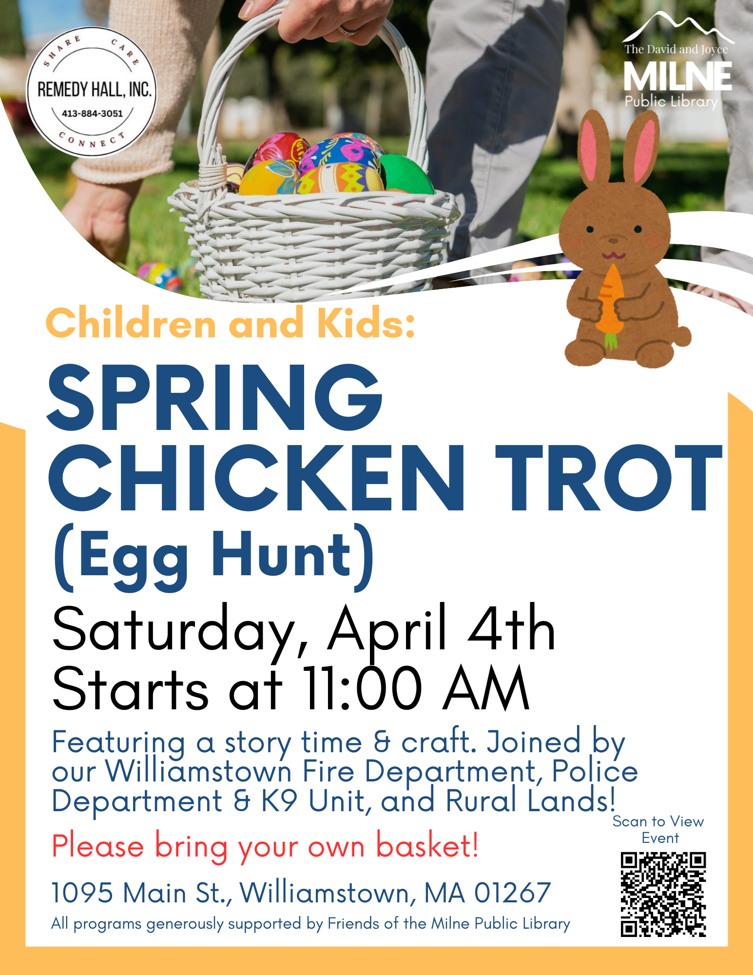 Join Remedy Hall and the Milne Public Library for our annual Spring Chicken Trot - an egg hunt across the library grounds tomorrow, Saturday, April 4th at 11:00 a.m.!