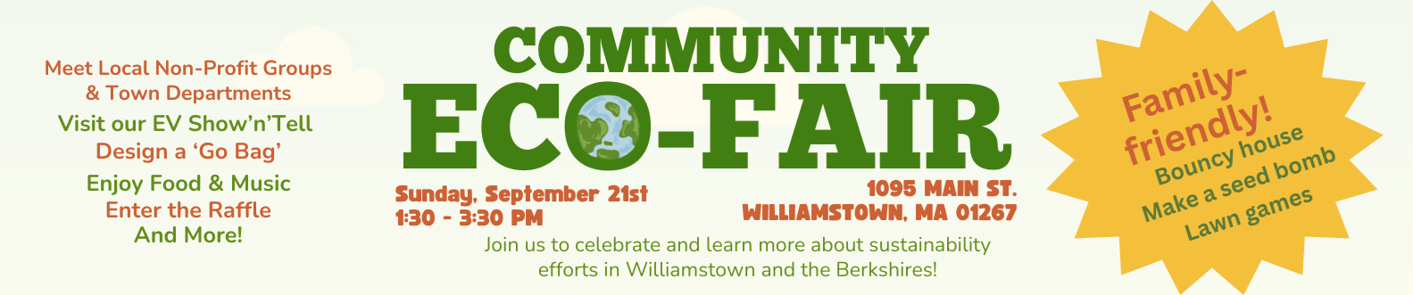 On Sunday, September 21st from 1:30 - 3:30 p.m. we will host an outdoor Community Eco-Fair, to raise awareness about our changing climate in honor of Climate Preparedness Week and to celebrate the many Williamstown and other Berkshire County groups working towards social, economic, and environmental sustainability.