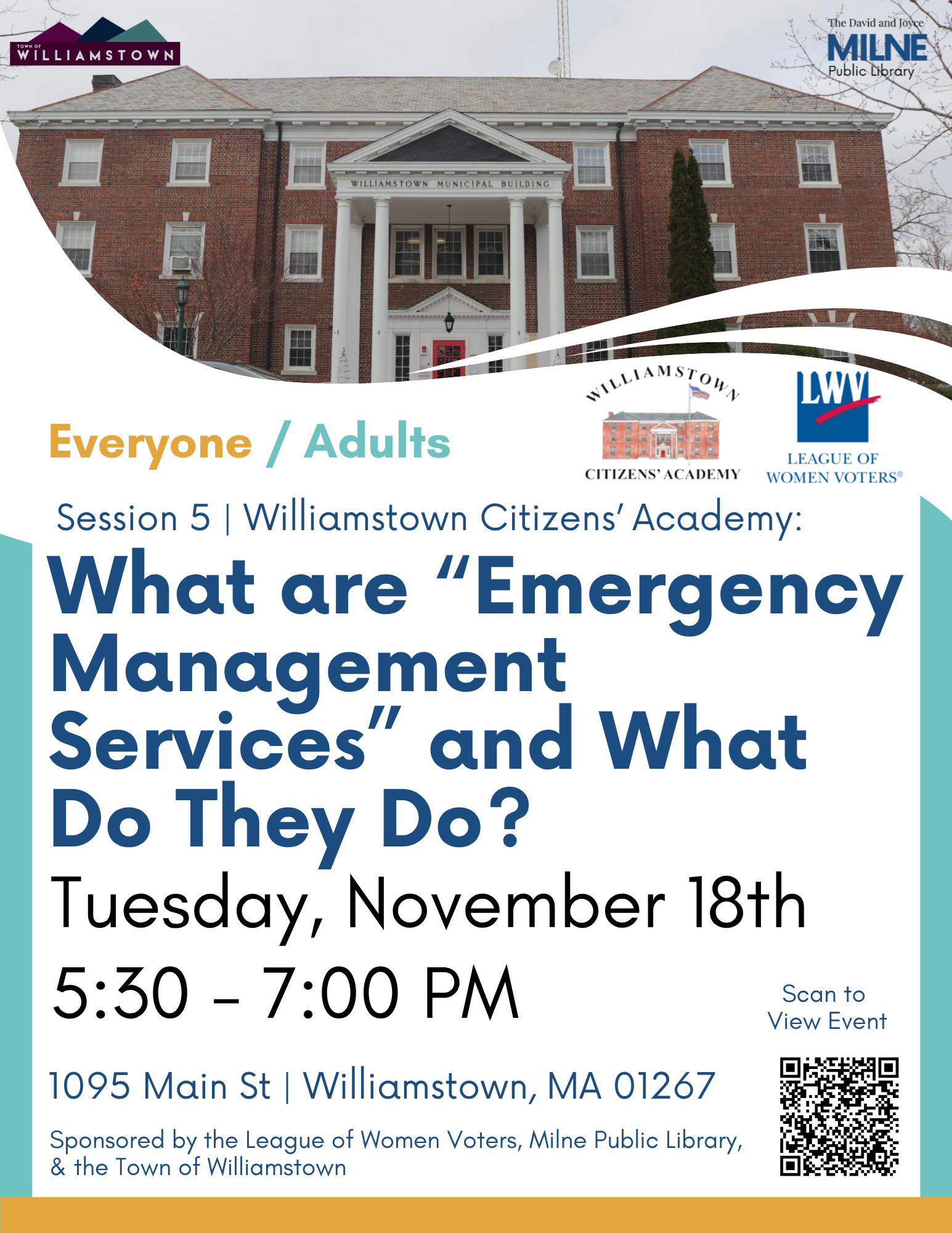 | Join the next Citizens' Academy session Tuesday, November 18th at 5:30 p.m. with Emergency Management Services to tell us all about the newly formed Northern Berkshire EMS.
