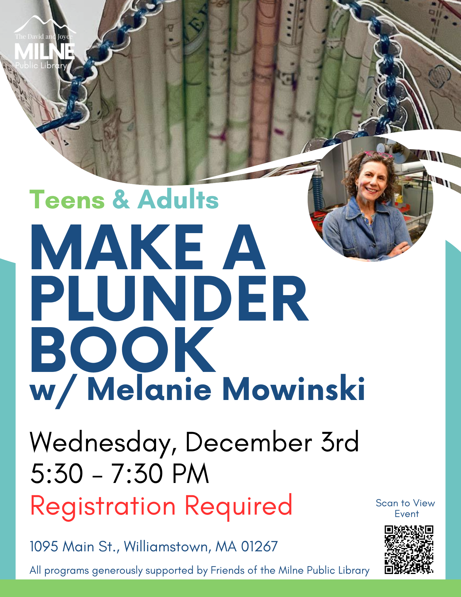 Melanie Mowinski, artist and MCLA art professor, will lead a creative workshop for us Wednesday, December 3rd at 5:30 p.m. She will challenge your idea of a what a book is or could be. You will get to be silly and spontaneous, and see what kind of "book" you come up with!