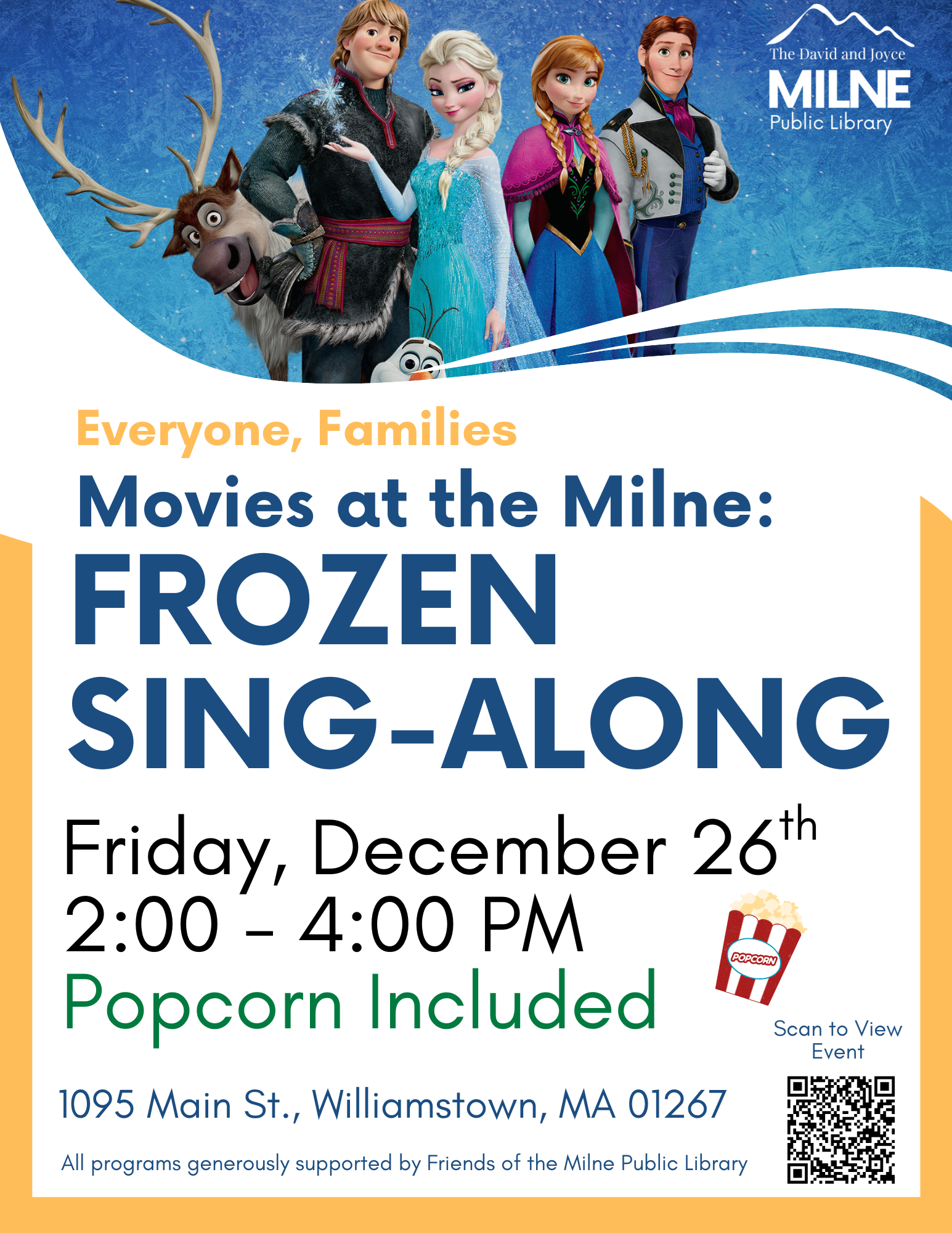 Join us Friday, December 26th at 2:00 p.m. for the sing-a-long version of "Frozen" and make some noise! (All the lyrics will be on the screen for you, no memory required.)
