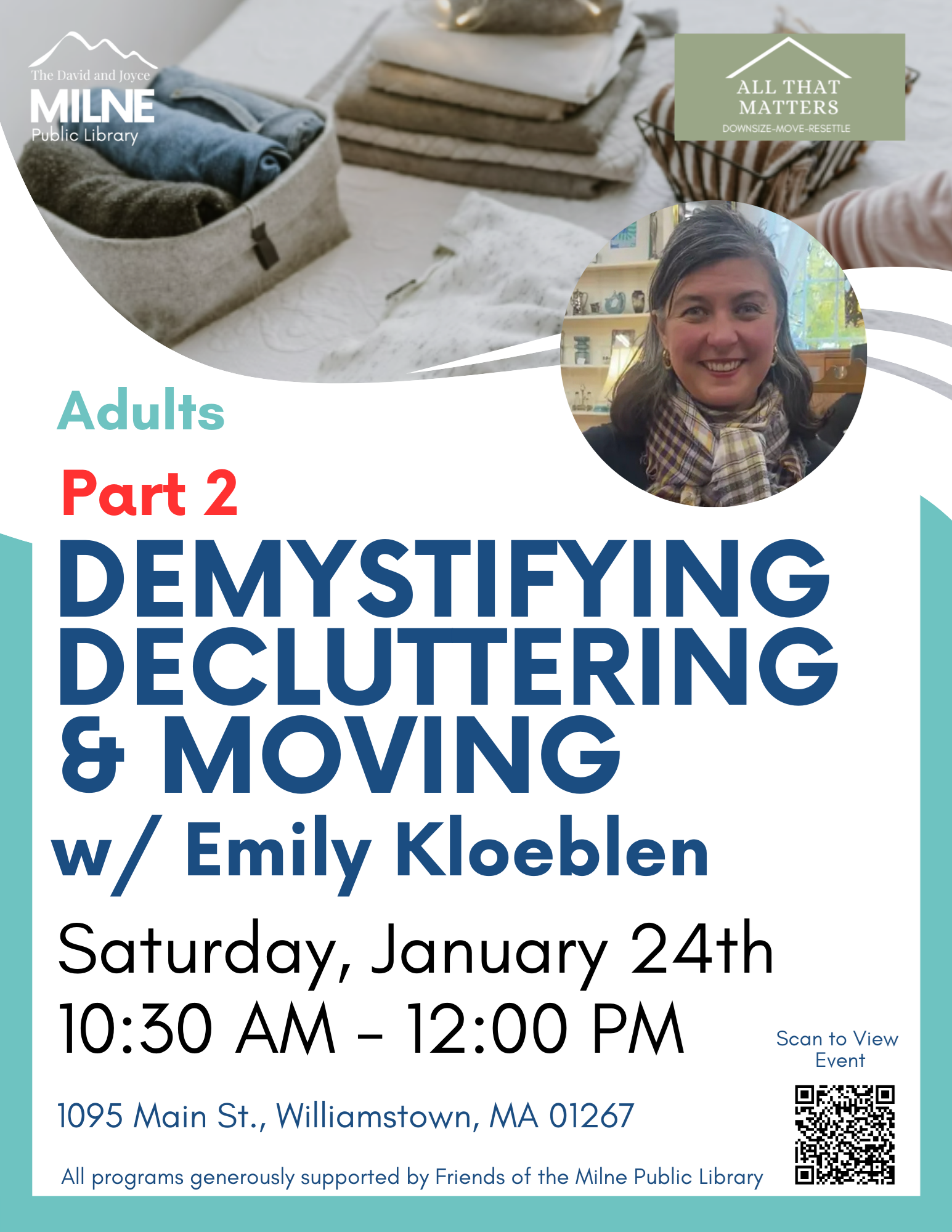 Join Emily Kloeblen, a professional organizer, Saturday, January 24th at 10:30 a.m. for part two of her decluttering and moving workshop!
