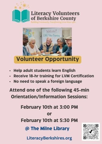 The Literacy Volunteer of Berkshire County is hosting two, 45-minute information sessions at the Milne Public Library for those interested in: - Helping adult students learn English - Receive 18-hour training for an LVM Certification Knowing how to speak a foreign language is not required.