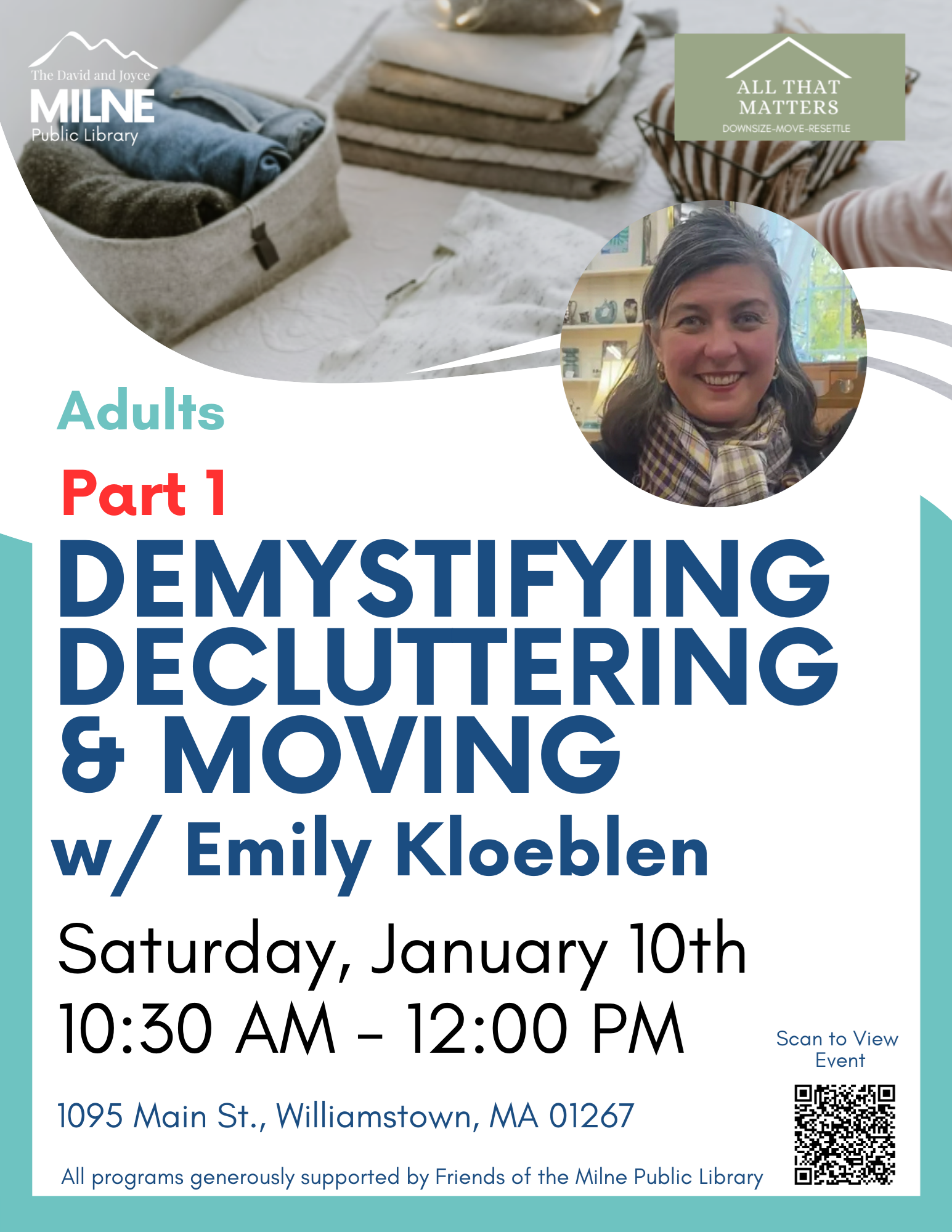 Join Emily Kloeblen Saturday, January 10th at 10:30 a.m. for part one where she will share helpful tips and tricks for tackling the often daunting task of downsizing, moving and (or) resettlingtable.