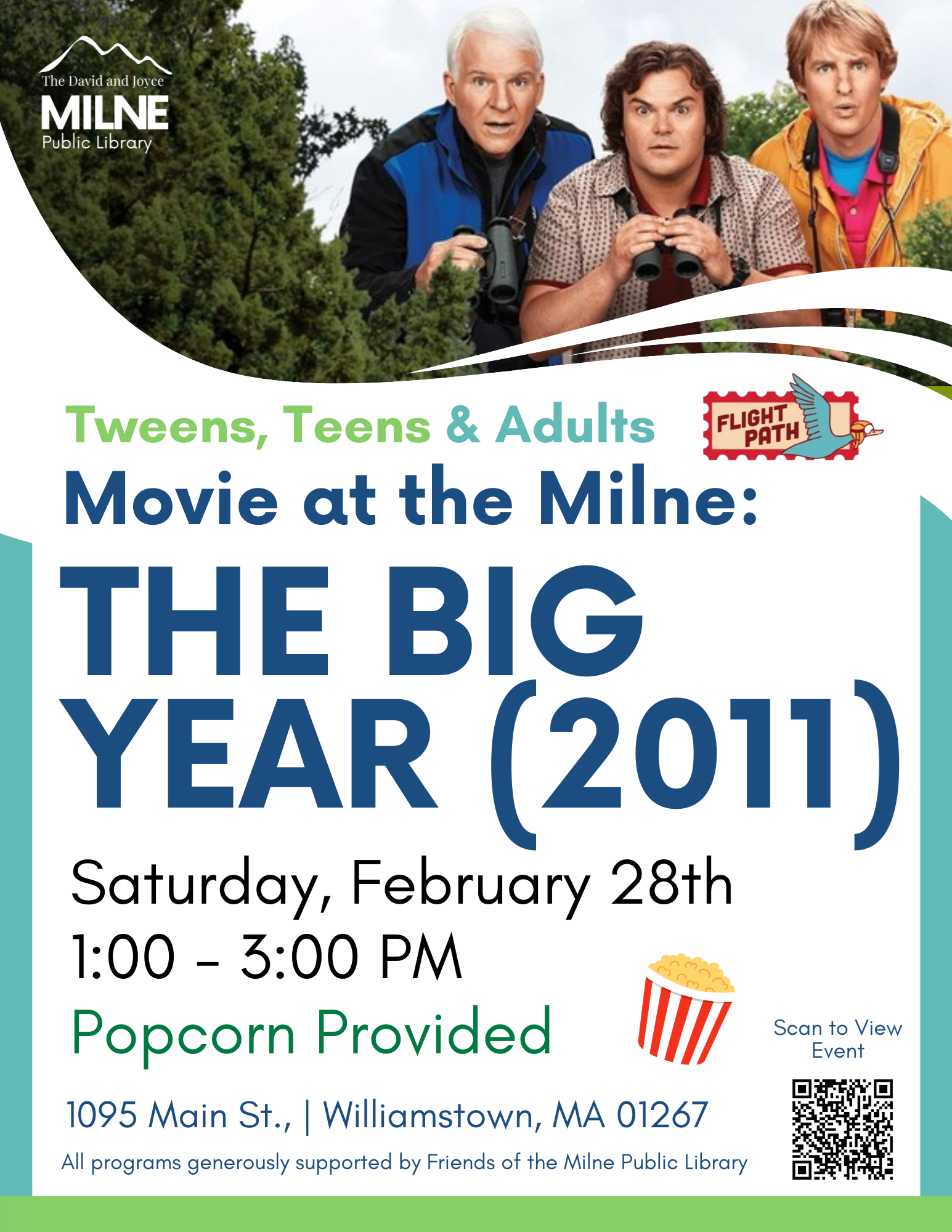 Join us tomorrow, Saturday, February 28th at 1:00 p.m. to watch "The Big Year," a comedy about obsessed birdwatchers in their attempt to defeat the world bird-watching recordholder!