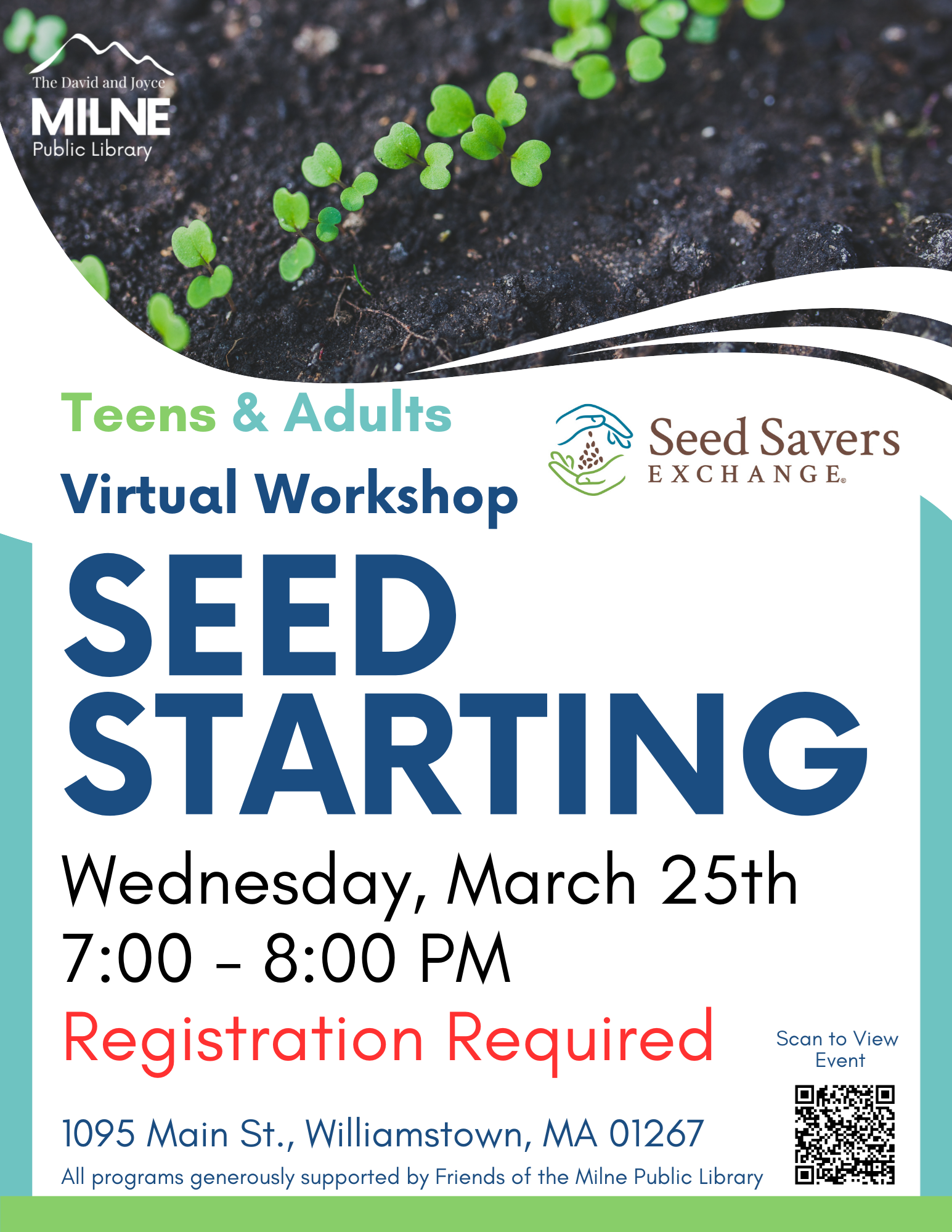 | Join us Wednesday, March 25th at 7:00 p.m. for a virtual workshop. In this class, you will be discussing several ways to start and nurture seeds and seedlings before they head outside to your gardens.