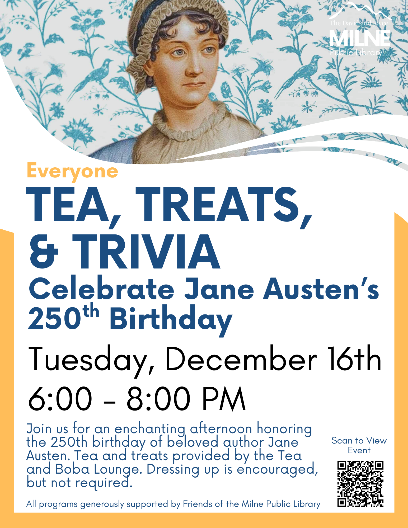 |  | Tea, Treats, and Trivia: Celebrate Jane Austen's 250th! |